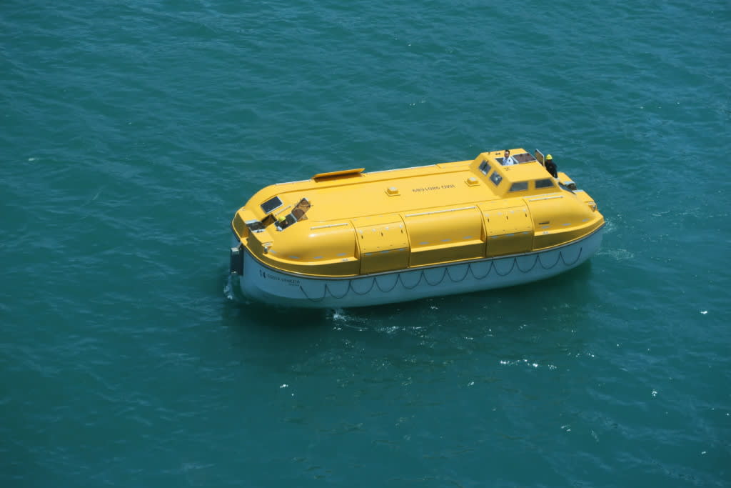 この日はクルー達の避難訓練が行われるということで、訓練中海の上には救命ボートが浮いていました。浮かんでいる救命ボートは結構大きかったです。