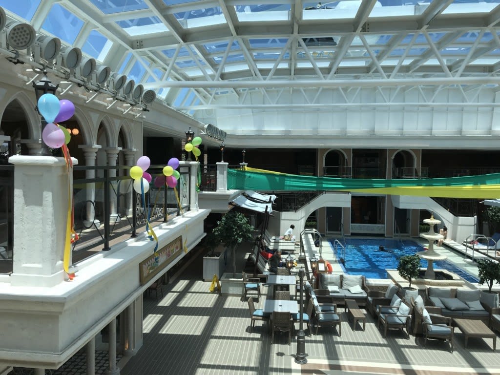 コスタベネチアに戻ってきたと思ったら、どんよりしていた曇天も綺麗に晴れ渡り、李ドマーケットプレイスのプールサイドも明るく開放的な雰囲気に。