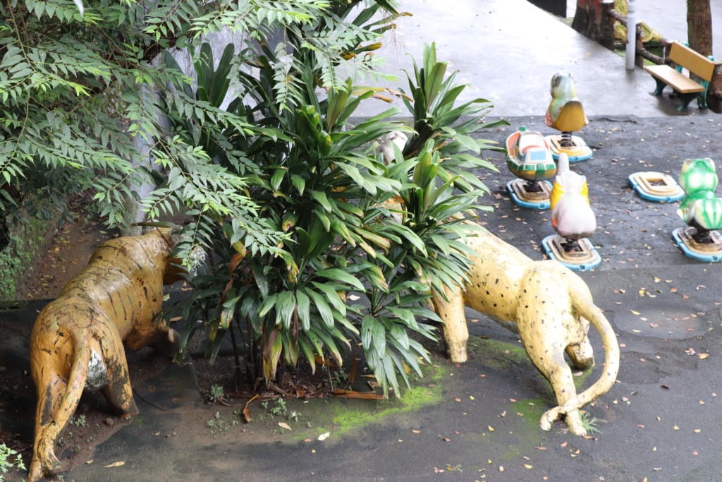 さらになだらかな傾斜になっている道を登って行きました。なだらかだけれど、結構な距離。途中に小さな公園で猫を眺めつつ、公園のリアルな動物像に驚く。