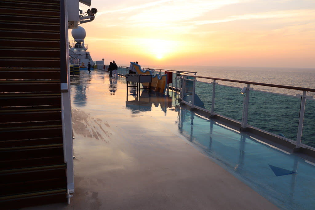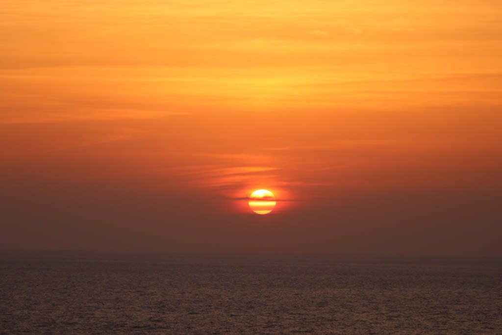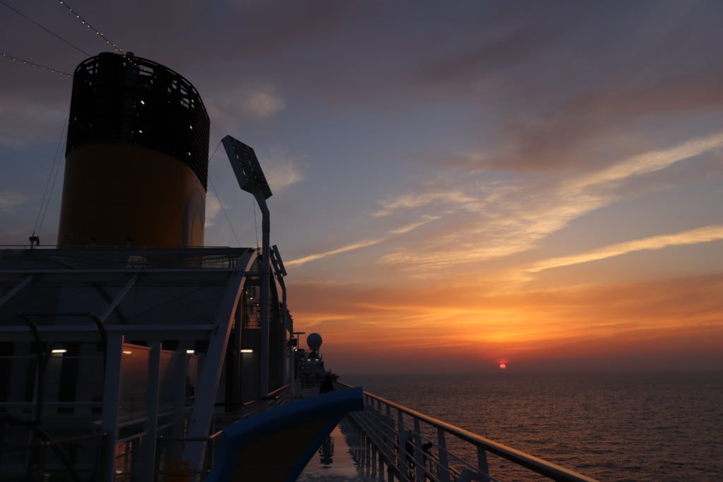 コスタベネチア乗船6日目の朝、日の出を見ることができました。夕日みたいですけれど、朝6時過ぎのデッキからの景色です。