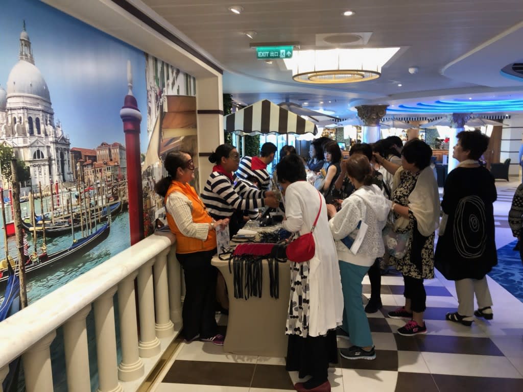 「ベネチアのカーニバルでは仮面をつけてご参加ください」と船内新聞に書かれていました。ゴンドララウンジの近くでは仮面販売も行われており、ちょっと覗いてみました。1,000円前後で売られていました。(売価はドル表示です)