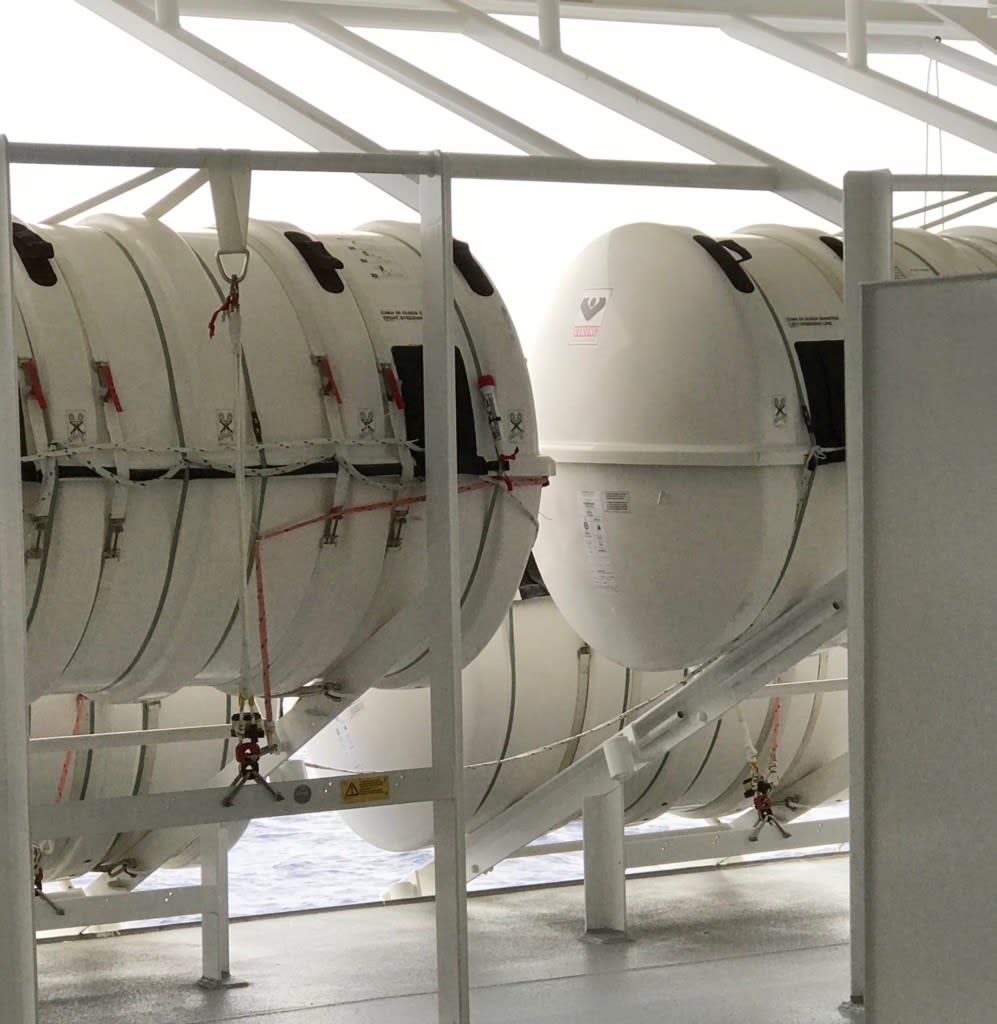 最近できたクルーズ船の救命ボートの乗船定員数は314人。乗客・乗務員全員が乗れるボートが船体に取り付けられているそうです。