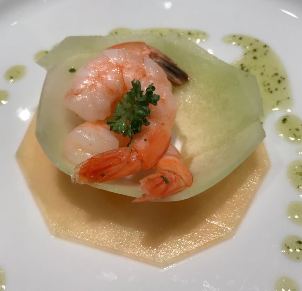 メロンのカルパッチョ エビのレモンソース添え。