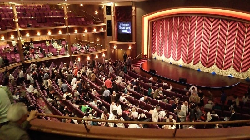 ■因みにショーやミュージカルを開催する『3層ぶち抜きのホール』は、ざっくり計算すると、1300人は収容できます。全乗客のほぼ3分の1ですね。椅子同士間隔も至って普通で、本格的です☆