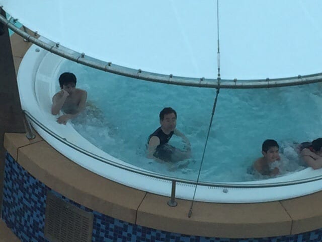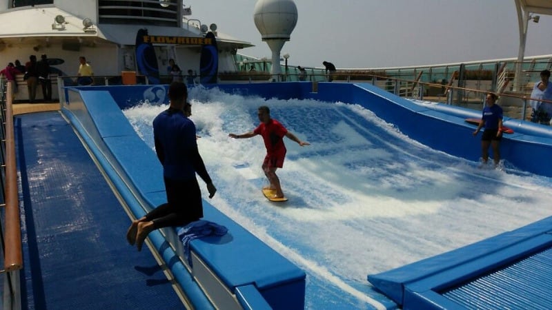 ■ウェイクボード流水ブース☆ 老若男女歓声を上げて楽しんでました。インストラクターが滑ると一段とエキサイトします。ここはデッキ12の最船尾で、絶景の海を眺めて滑る事が出来ます……顔を上げるほどのテクニックがあれば(笑