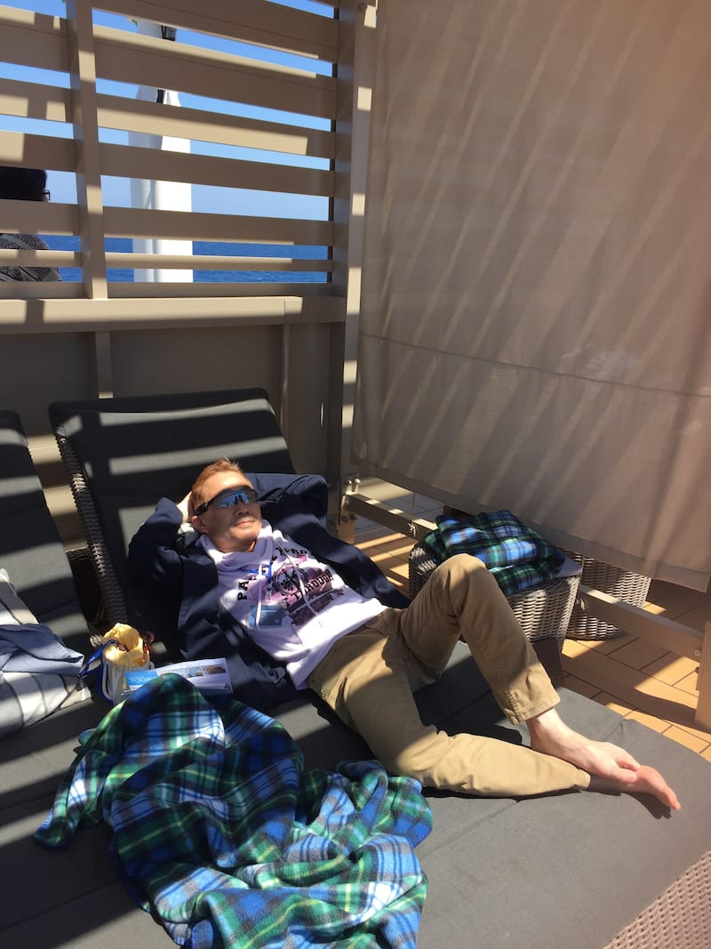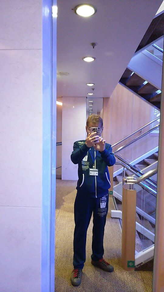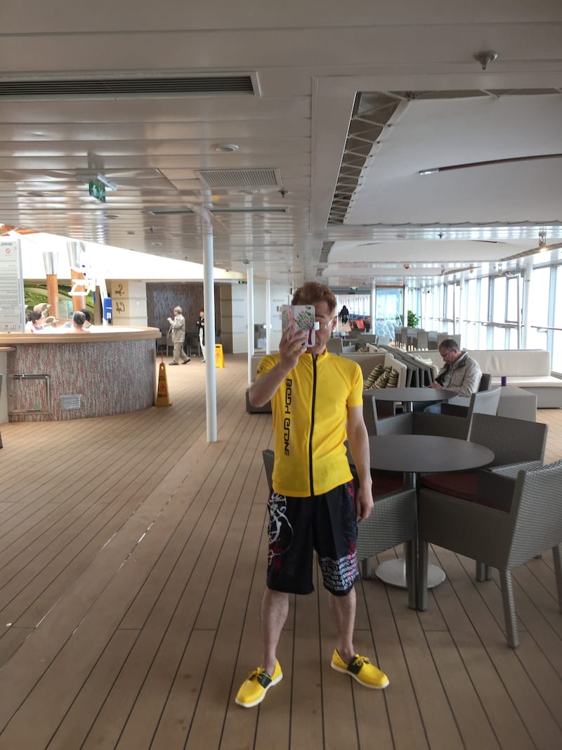 なお、下は煙草を吸っている私ですが、クルーズ船は客室内は禁煙の上、この11階もある巨大クルーズ船の4階と10階、11階に僅か1か所づつあるのみで、1本吸うにも往生する人も居ると思います