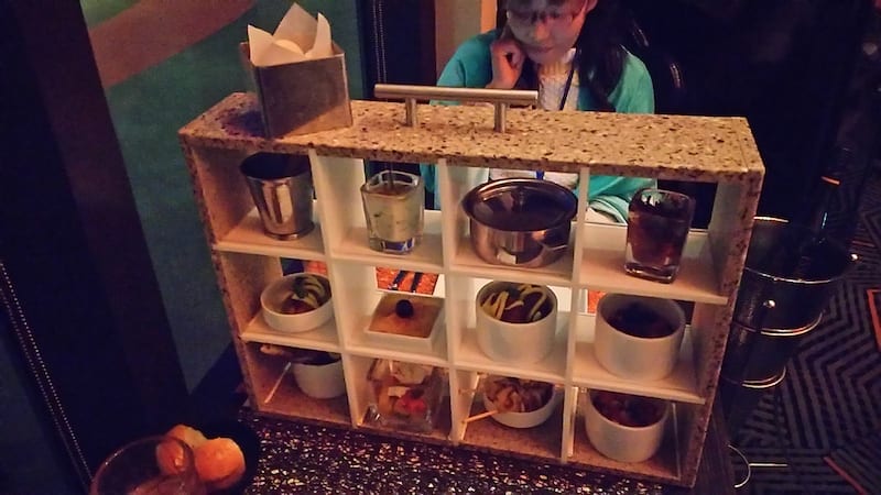 ↓大理石の引き出しを12区画に区切って12種類の料理。オモロいw