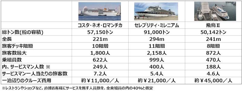 特に注目すべきは、飛鳥Ⅱとロマンチカを比較した時、総トン数は大きく変わらないのに、ロマンチカは飛鳥Ⅱの2倍以上の旅客数だと言う事ですb