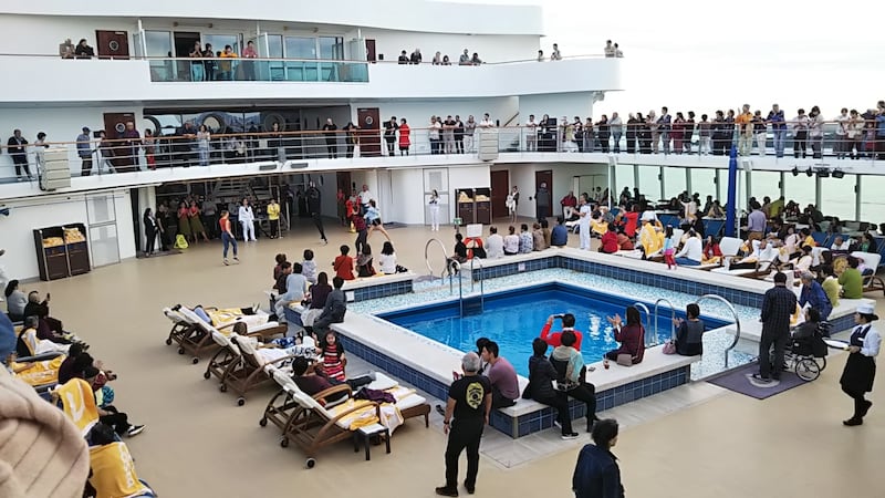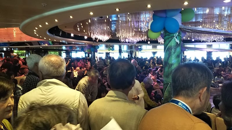 【初日出港直後のアッパーデッキウェルカムイベントと人だかり】