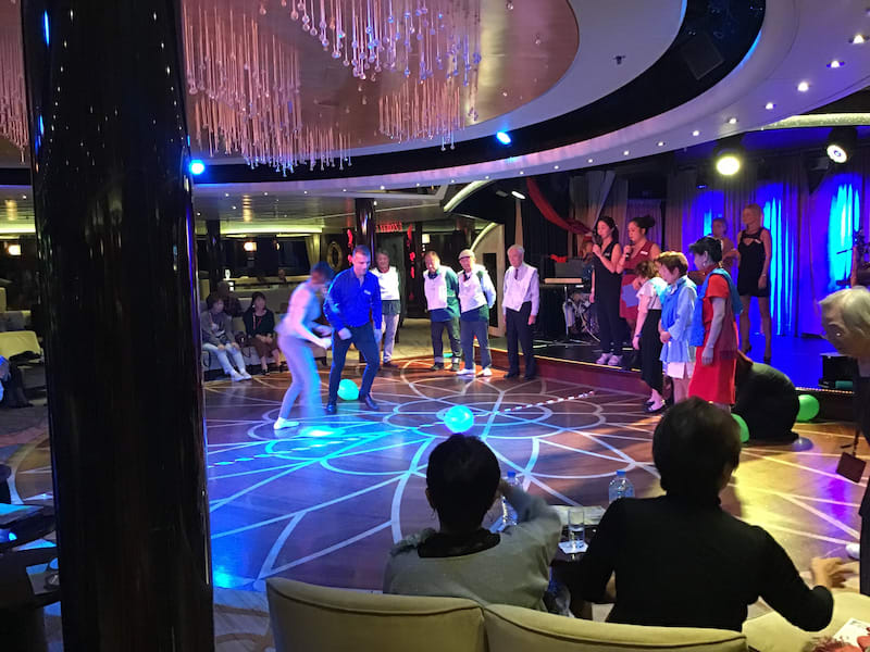 (というか、シアター設備等、大ホールが無いのでそういうイベントにせざるを得ない、のかも知れません。船会社【コスタクルーズ】が所有する大型船では、2~3階層吹き抜けのシアターホールが存在しますから、そんな大型船までも常に参加型イベントばかり開催するとは考え難いのですb)