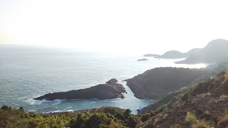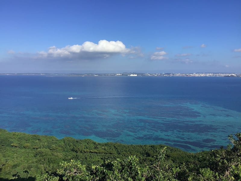 【伊良部島から宮古島側を見る。中央に白く見えるのは停泊中のロマンチカ】