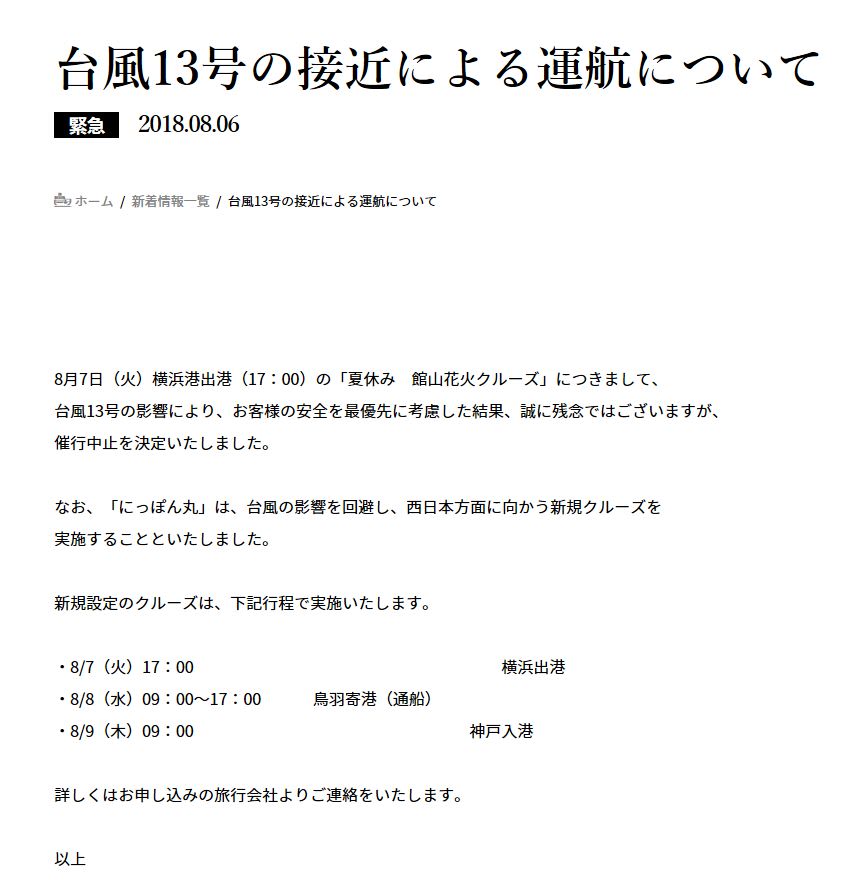 台風を避けて、横浜ー館山ー横浜のクルーズを横浜ー鳥羽ー神戸に変更するので、クルーズをキャンセルしても良いし、代替クルーズに参加する場合は神戸ー横浜の移動の補填として割引しますよ。