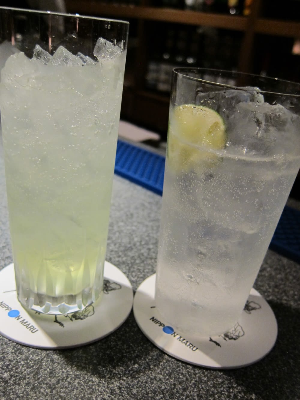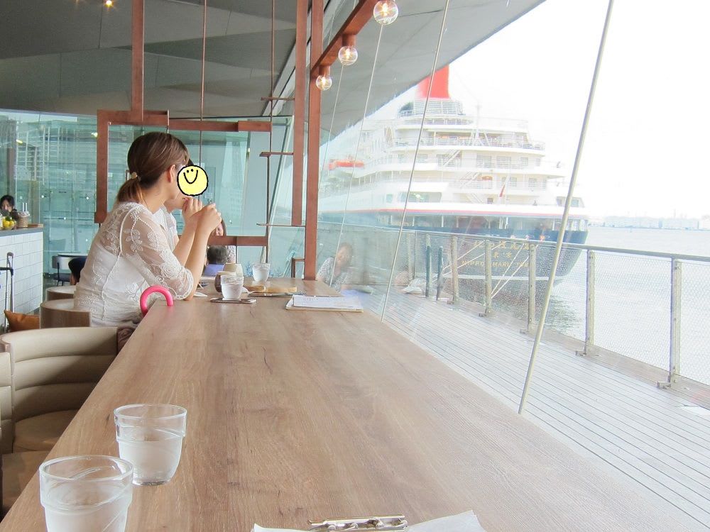 カフェレストランのブルーターミナルで、にっぽん丸を眺めながらジュースを飲んで時間を過ごします。