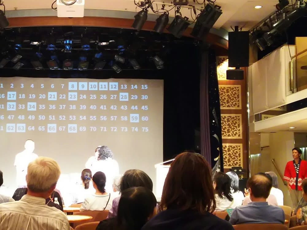この夜はビンゴ大会も開かれました。景品はにっぽん丸のグッズや旅行券などです。
