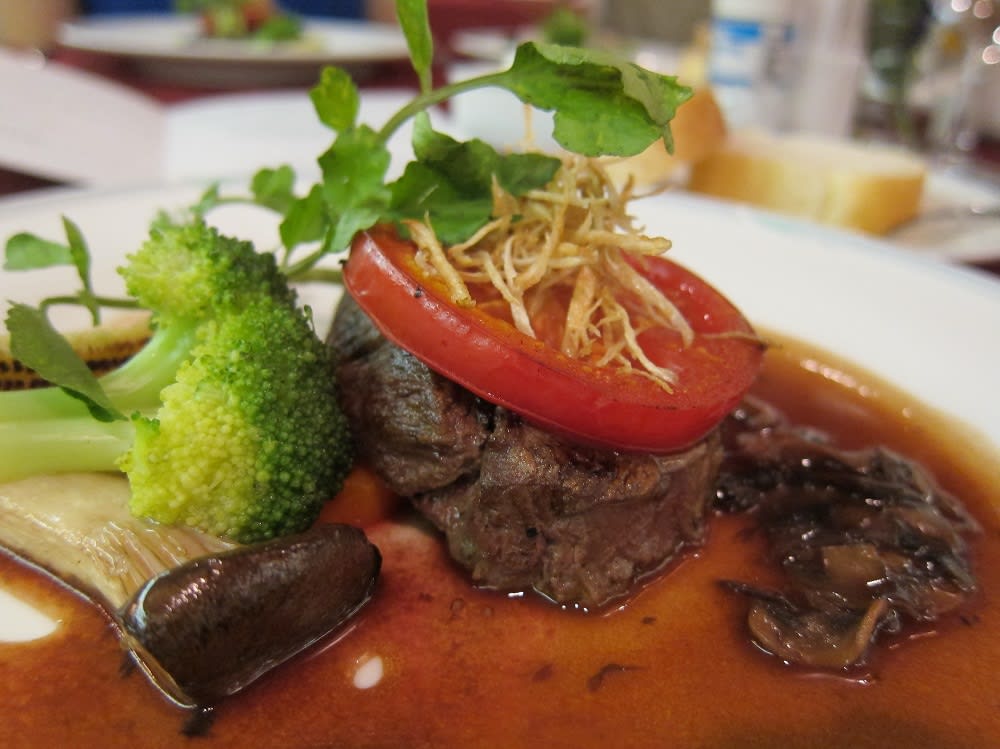 国産牛フィレ肉のマリナードステーキ焼きトマトを添えて シャンピニョン赤ワインソース