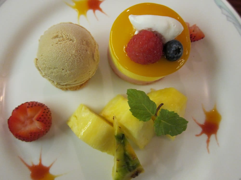 ゴールデンパイナップル、ラズベリーとマンゴーのムースケーキ コーヒーアイスクリームを添えて