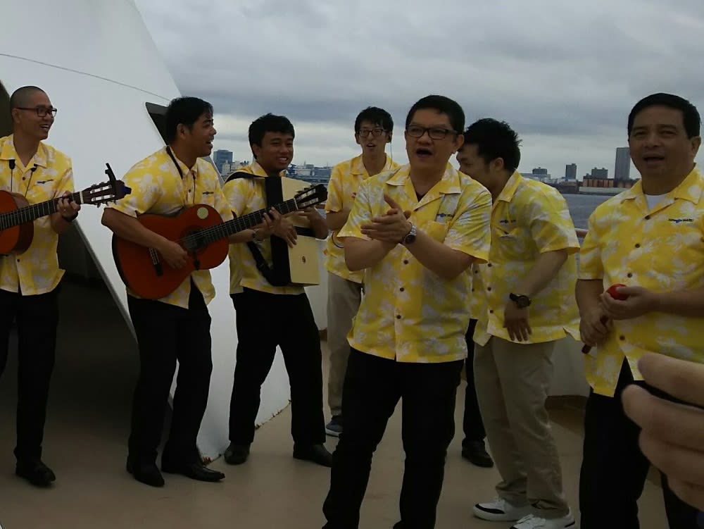 にっぽん丸のハウスバンド《アスール☆プラ☆プティ》の皆さんが、陽気に演奏して盛り上げてくれます。