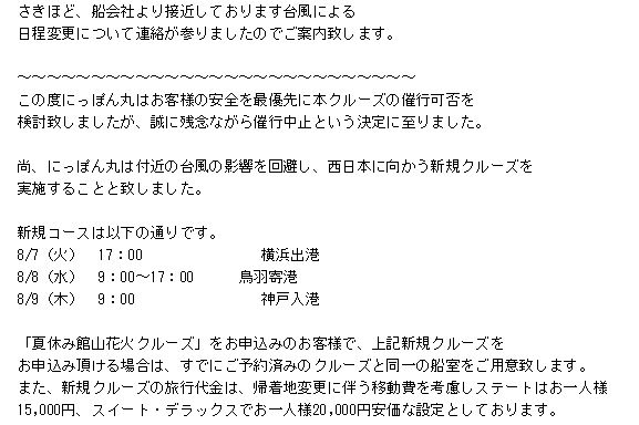 トマトちゃん(娘)の場合、台風13号の影響で中止になった『館山花火クルーズ(8/7~9)』を、最初に予約していて、まだ予約の取れた『熱海花火と冬の味覚クリスマスクルーズ(12/15~18)』に戻すこともできました。