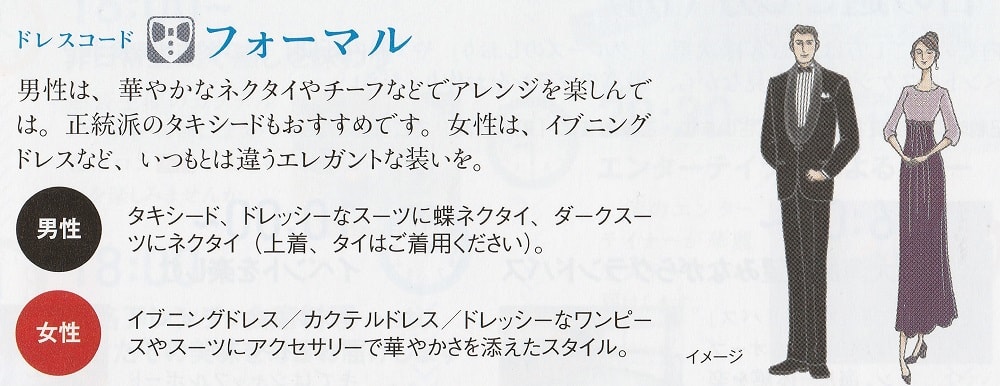エレガントな装い。男性はタキシード~ダークスーツにネクタイ。女性はイブニングドレス~ドレッシーな服装。