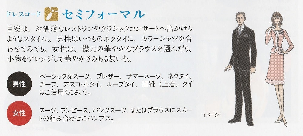 お洒落なレストランやクラシックコンサートへ出かけるような服装。男性はジャケット、タイ着用。女性はスーツやワンピースなど。