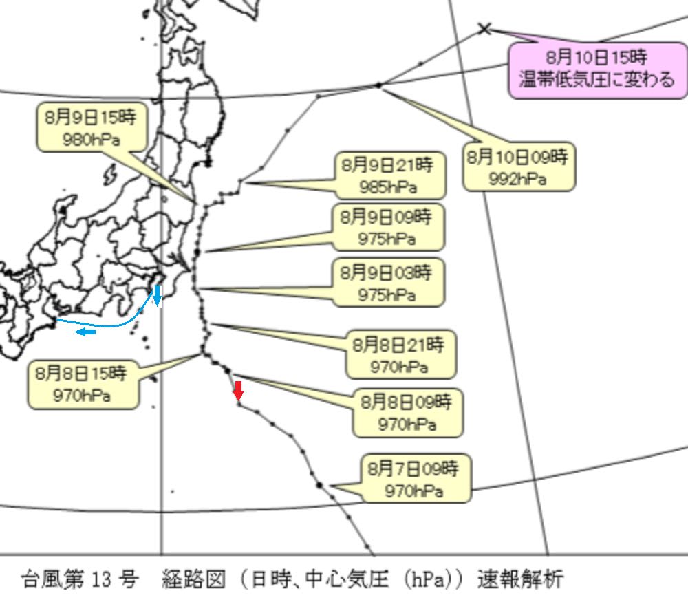こちらは銚子地方気象台のデータをお借りして、大まかな航路(水色)と出港時の台風の位置辺り(赤矢印)を加えてみました。
