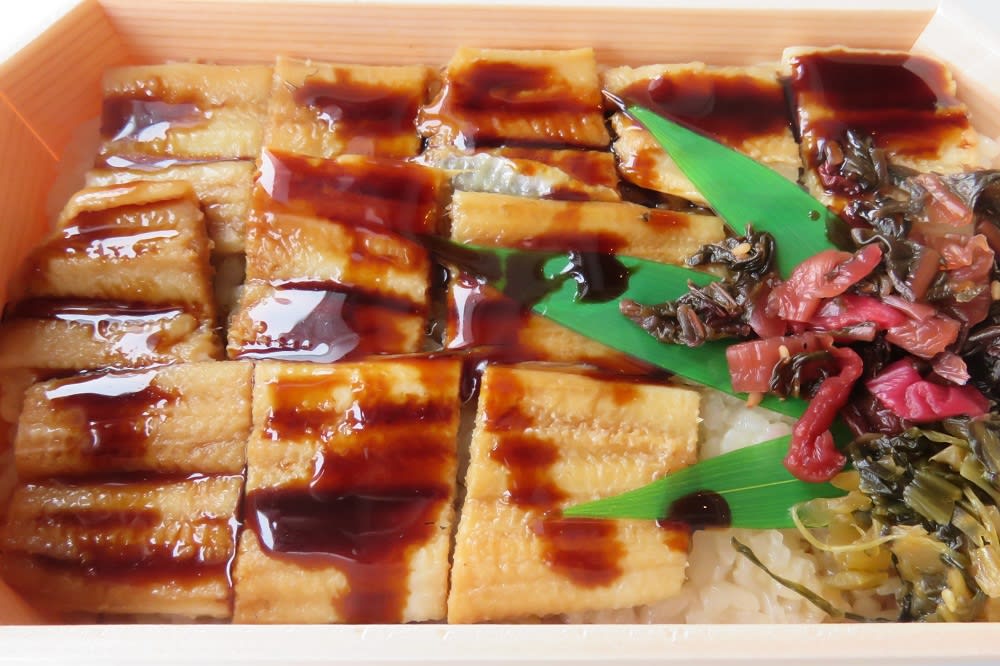 ふたを開けると、びっしりと敷き詰められた煮あなごに、おつけものが添えられています。