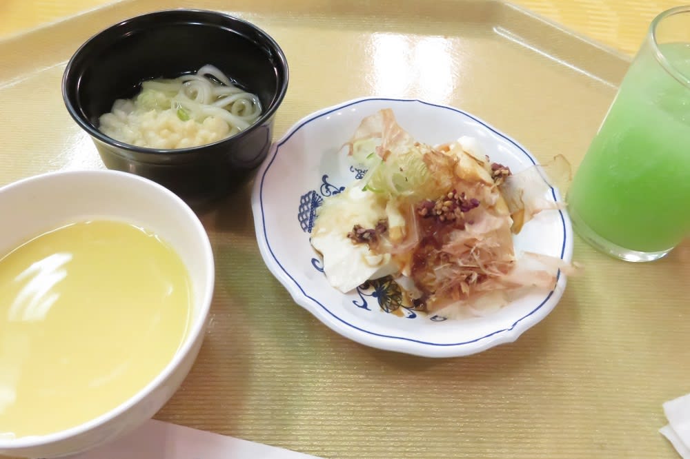 自家製豆腐とたぬきうどんとスープバーからコーンスープを持ってきました。(゜д゜)ウマー