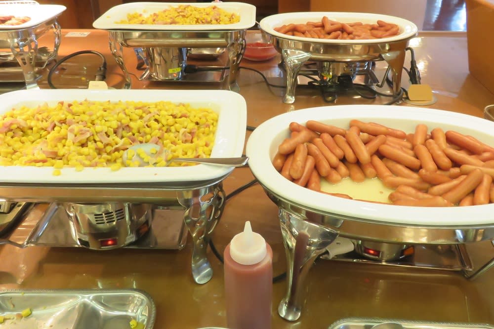 ウィンナーにコーンと朝食定番の食べ物が並びます。