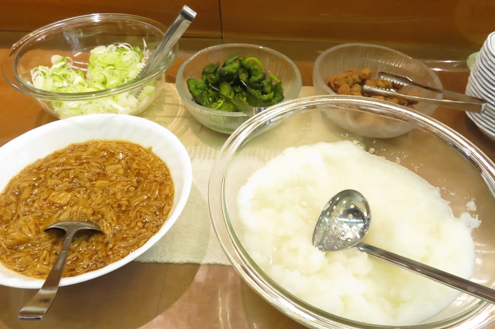 梅干、漬物、大根おろしになめ茸、ネギと朝食をカスタマイズ出来るものも一通りありましたョ♪