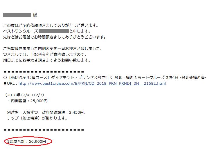出航1ヶ月半前の10月の中過ぎ頃に担当さんにお電話して。