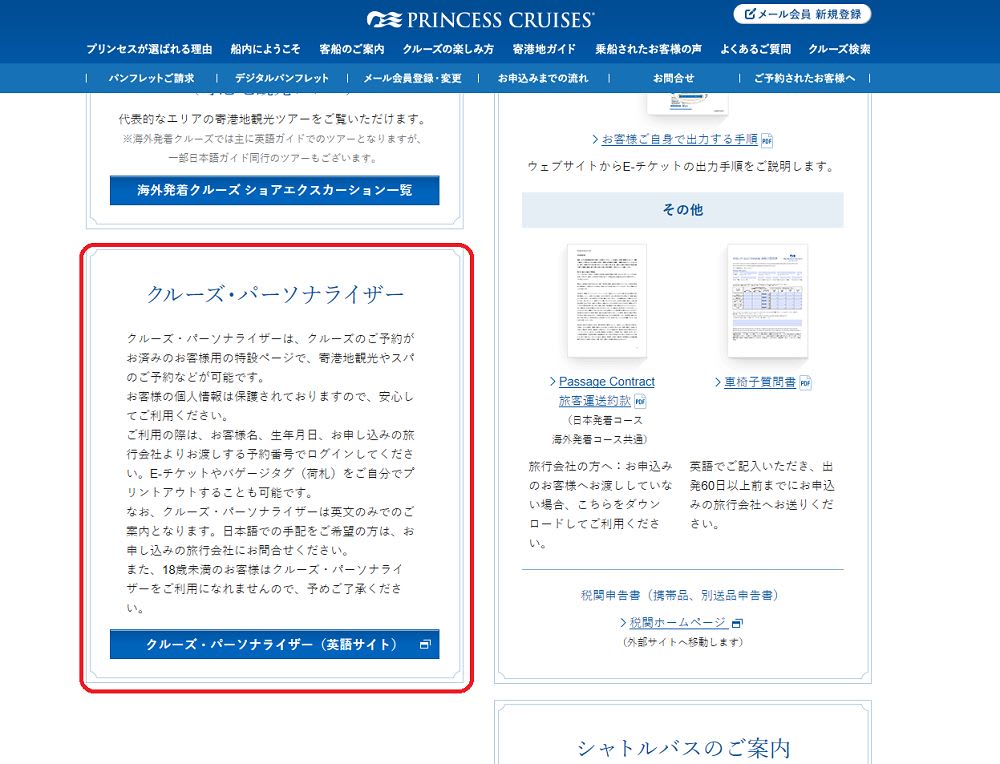 予約が通ると、プリンセスクルーズのサイトで、クルーズ・パーソナライザーを使えるようになります。