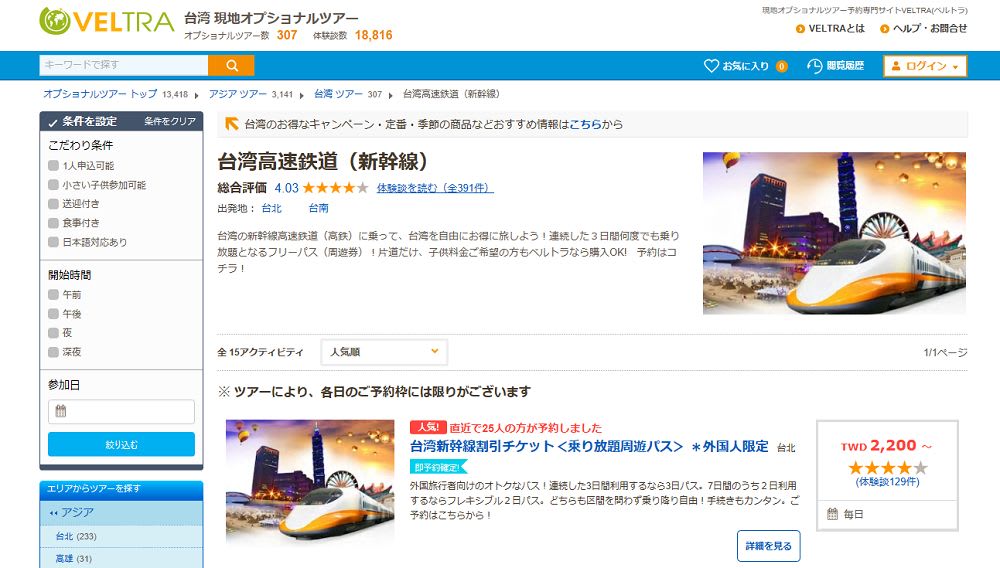 オプショナルツアー販売サイトVELTRA(ベルトラ)を通して、台湾高鐵の乗り放題パスを購入するともっとお得に乗れちゃうかも?