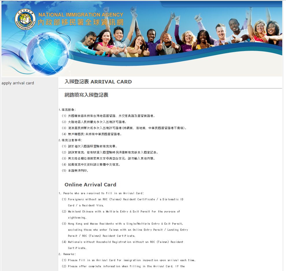 台湾の入国管理局のサイトで、台湾への入国カードを出発前に申請できるらしいとの情報を見つけました。