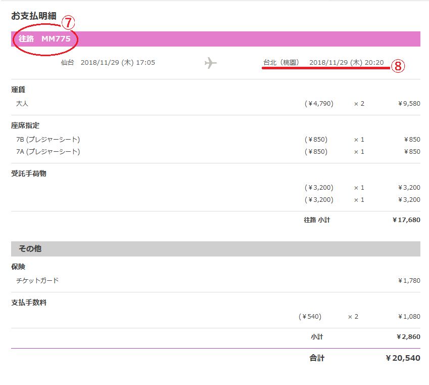 私たちが乗ったピーチの仙台ー台北便なら、⑦MM775がフライト番号です。