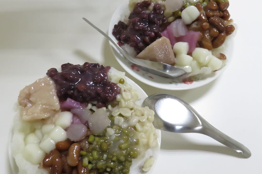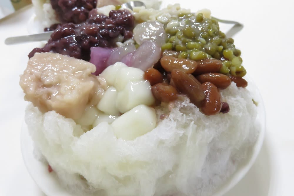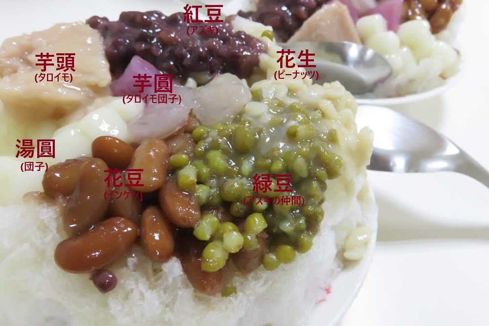 味のついていないかき氷の上に、緑豆 (アズキの仲間で、もやしは緑豆を発芽させたもの。)花豆(インゲン)花生(ピーナッツ)芋頭(タロイモ)芋圓(タロイモ団子)湯圓(団子)紅豆(アズキ)を山盛りにして、シロップがかけられます。