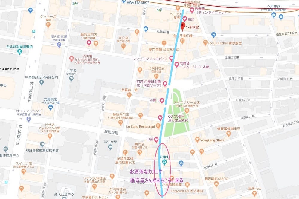Googleマップに今回の永康街の街歩きポイントを記してみました。