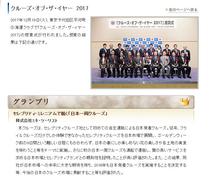 また日本国内では、日本外航客船協会(JOPA)主催のクルーズ・オブ・ザ・イヤーで、2017年に『セレブリティミレニアムで航く日本一周クルーズ』がグランプリを獲得しました。