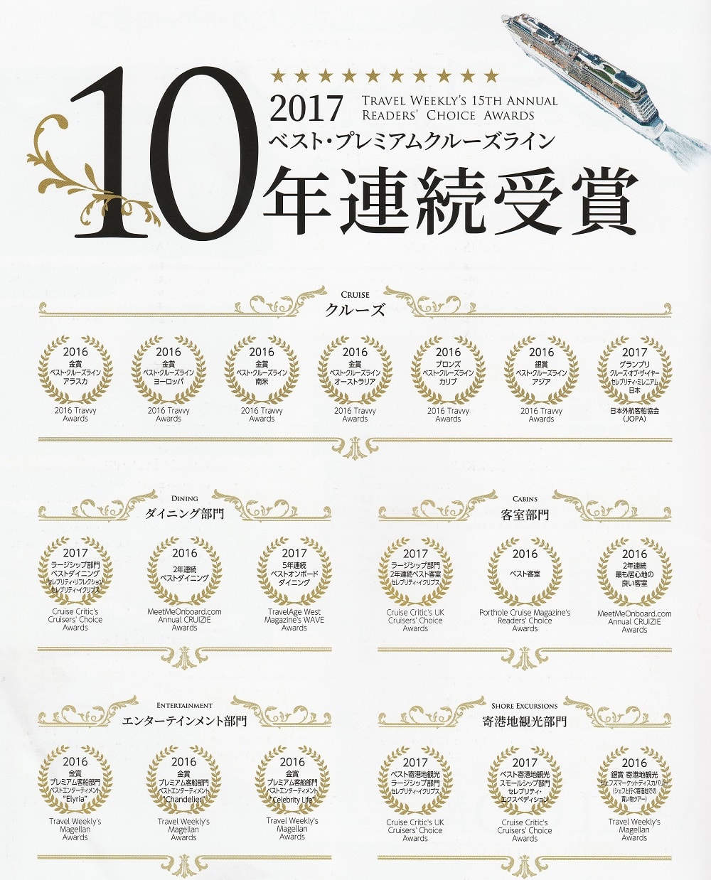 こちらは2019.4~2020.3のセレブリティクルーズのパンフレットに記載されていた受賞歴です。
