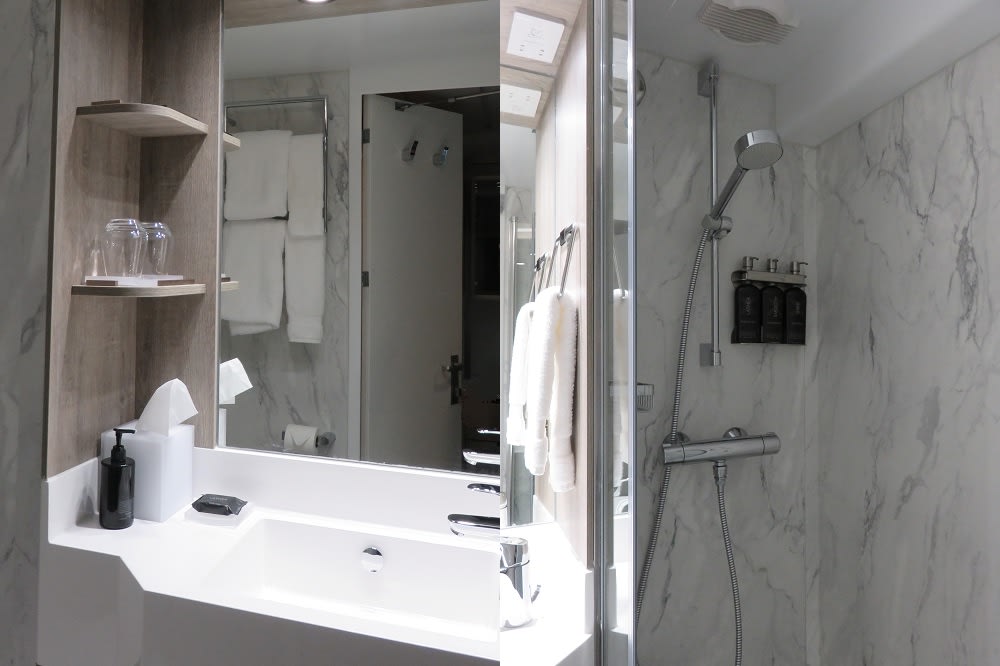 船室の設備【ツイン(ダブル)ベッド、窓、電話、クローゼット、ドライヤー、タオルバスタオル、シャンプー、110/220V共有電源、最少収容人数1名、バスローブ、シャワー、テレビ、化粧台、ミニバー、金庫、石鹸、室内温度調節】