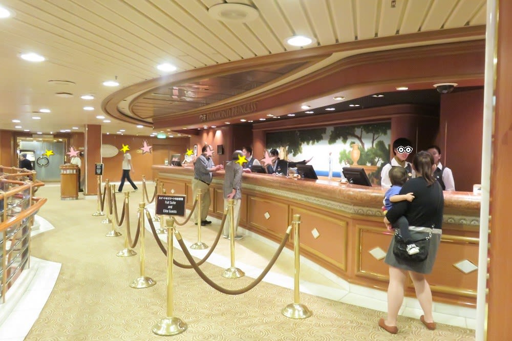 船室のトラブルなど、困った時は②ゲストサービスデスクへ行きましょう。d(゜-^*)