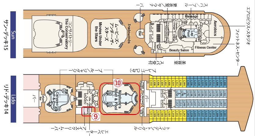プロムナードデッキ・7Fを探検した後は、リドデッキ・14Fへ。