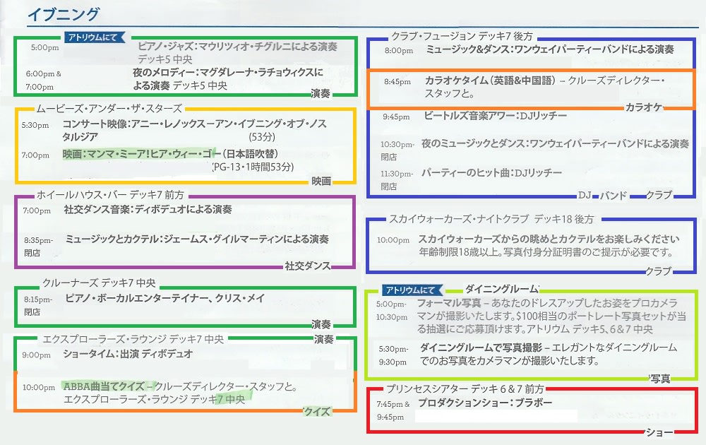 hiro1967: 「船内新聞をよく読んで自分が興味あるイベントを見つけることです。 船内新聞をマーカーで色付けをするとお目当てのイベントが分かりやすくなりますョ。d(゜-^*)」