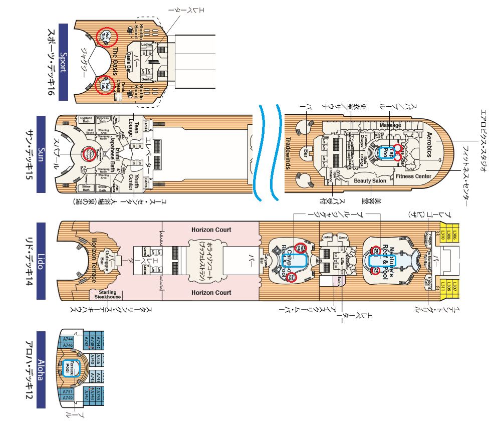 大体のプールとジャグジーはセットになっていましたが、船尾のテラスプール(12F)とジャグジー(16F)は、場所が離れています。