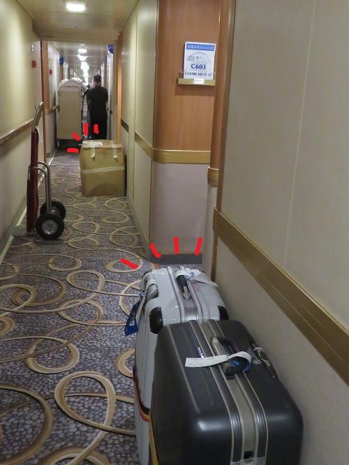 まぁ。大体の人は、大きなスーツケースは事前に降ろしてもらって、自分では手荷物だけ持って下船する方法を選ばれるかと。σ(´∀`me)??