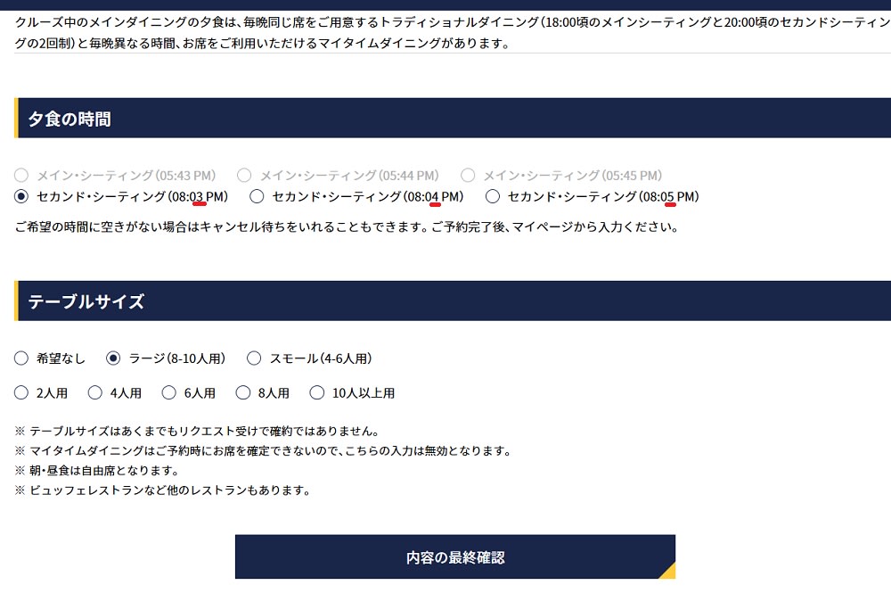 hiro1967: 「夕食の予約について 08:03PM/08:04PM/08:05PM…末尾の3・4・5はメインダイニングのデッキの数字だそうです。(´-`) ヘー 香港発着ボイジャークルーズはオープンシーティングのため、テーブルサイズは何を選んでも関係なしでした。」