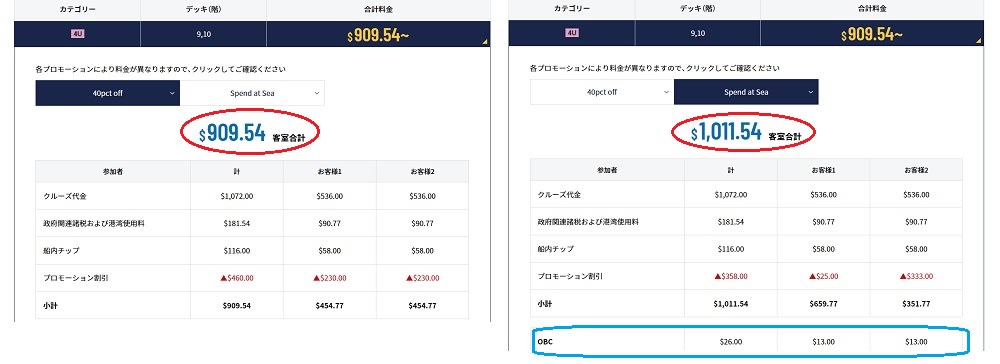 右側のプロモーションではOBC(船内でご利用いただけるおこづかい)が付いていますが、その金額を差し引いても左のプロモーションの方が安いです。