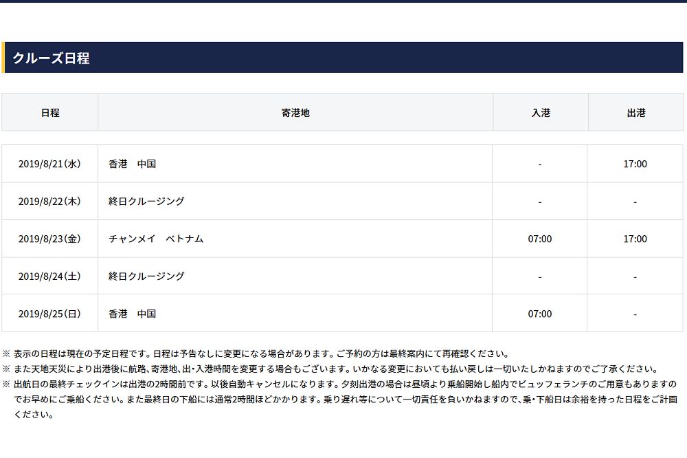 香港を出発して、ベトナムのチャンメイに寄港してまた香港に戻る4泊5日のショートクルーズです。