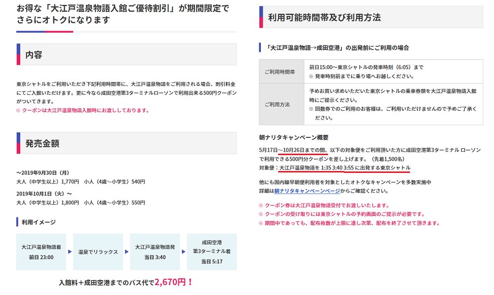 大江戸温泉物語と東京シャトルのセットプランなら、¥1770(2019年10月1日からは¥1800)ととってもお得。