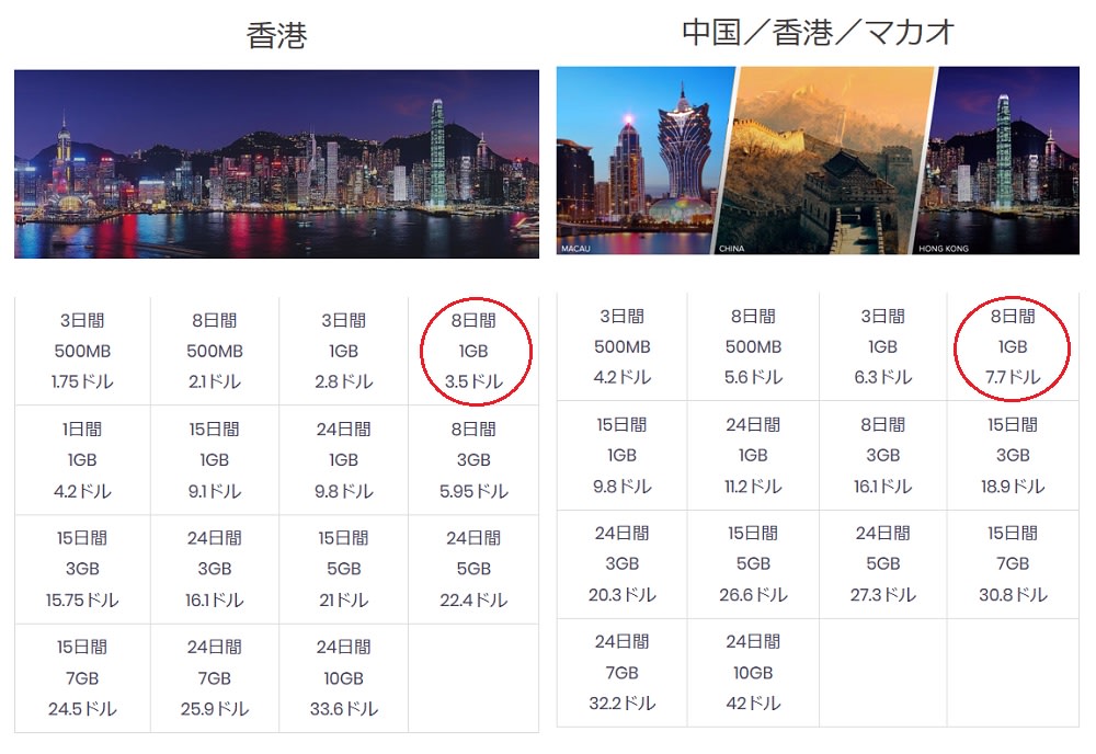 私は香港だけなので、香港単独8日間で1Gまで使えるプランを購入しましたョ。(σ・∀・)σ