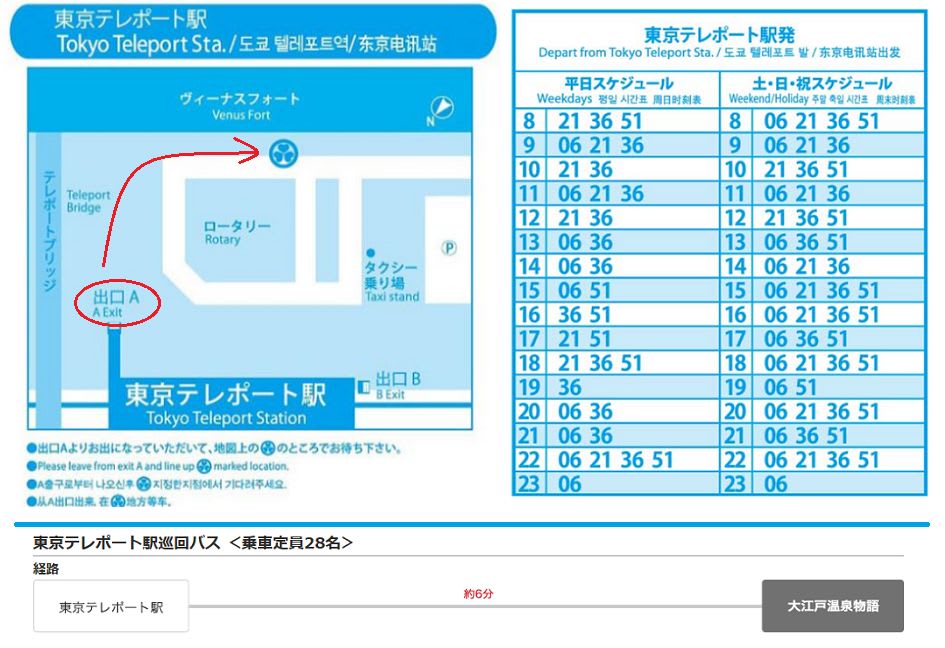 お台場・大江戸温泉物語のシャトルバスは、東京駅・品川駅・新宿などあちこちから出ていますが、一番本数があるのが東京テレポート駅なので、こちらからシャトルバスを利用するのが良いでしょう。 d(゜-^*)